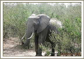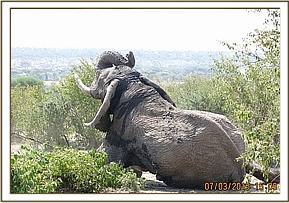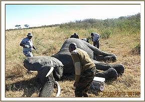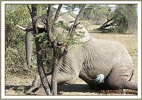 Immobilization was achieved by use of 17mgs Etorphine hydrochloride delivered through a 3ml Dan-inject dart from a vehicle. It took nine minutes for the drugs to take full effect with the elephant going down on his lateral side.