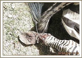 Examination revealed a tight winch wire snare round her fetlock joint that had eaten into joint tissues partially damaging some joint ligaments. The wire was cut loose leaving a raw wound. The wound was thoroughly cleaned and disinfected with tincture of Iodine. Oxytetracycline wound spray was then applied. In addition, the zebra was given an intramuscular injection of 3000mgs Amoxicillin antibiotic to counter sepsis.