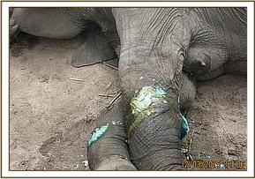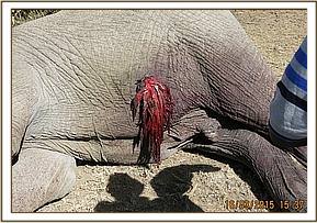 This elephant was found in a group of 15 elephants near a small valley. He appeared in pain and walked behind the rest of the elephants. His left abdomen had been punctured and was bleeding with part of the omentum hanging out.