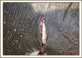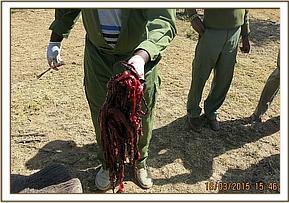 The spear was gently removed with bloody ingest seeping through the opening. Up to one meter of the spear had entered right into the abdomen with potential damage to vital abdominal organs. It was unfortunate; this giraffe succumbed soon after the spear was removed due to vital organ damage.