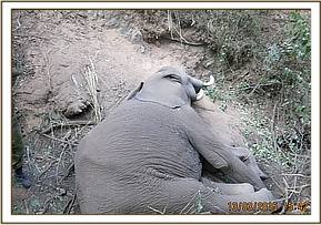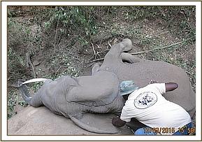 This elephant had fallen from an 80 feet cliff into a rocky valley. He appeared to have fractured his spine with both hind legs immobile. He could hardly raise his head and trunk. Examination showed that this elephant could have been in that position for at least five days with bed sores developing on the laid upon areas. There was also evidence of rhabdomyolysis as a result of pressure on muscles and long stay in that position.