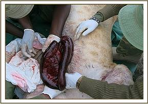 This lioness appeared to have received a nasty gore from a buffalo which punctured her ventral abdomen resulting in exteriorization of abdominal organs. Apart from the small and large intestines, the uterus and ovaries were also dangling. The opening was small and had caused considerable strangulation to these organs. Though there was no puncture detected on these organs, their long exposure to dry and windy environment had resulted in some degree of desiccation.