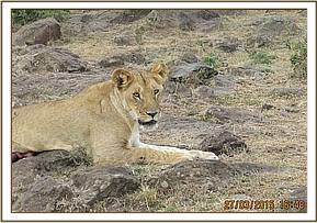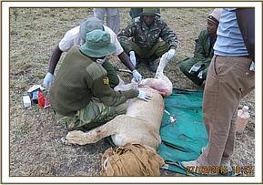 The Vet Unit found the lioness lying on a rocky area seemingly in pain. The rest of the pride, comprising of her mother and two brothers, were nearby. When agitated to stand, she did so with pain and difficulty. At this point, loops of intestines with omentum were seen dangling from the wound. Decision to immobilize and carry out closer examination was arrived at.