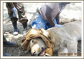 The lion was chemically restrained by use of a combination of 2mgs Medetomidine and 200mgs Ketamine in a 3ml Dan-inject dart from a vehicle. He remained calm after darting before being fully anaesthetized after eight minutes and a blindfold applied. Examination revealed injury to the left side of his head likely caused by a blow. The upper and lower canines on this side of the face were broken with bleeding gums and the tissues around the eye were also swollen. The eye appeared red with partial prolapse of the third eyelid due to swelling.