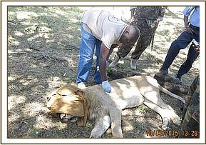 Immobilization was achieved by use of combination of 4mgs Medetomidine and 200mgs Ketamine delivered in a 3ml Dan-inject dart from a vehicle. The lioness was fully anaesthetized after seven minutes. A blindfold and Cloxacillin ointment was applied to the both eyes. After making sure she was stable, the examination of injury was carried out.