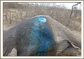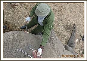 Restraint was achieved chemically by use of 16mgs Etorphine hydrochloride delivered in a 3ml Dan-inject dart from a vehicle. The drugs took full effect after ten minutes with the elephant assuming sterna recumbency. She was immediately pushed over to lie on her right side for safety and easier handling of the wound. The pinna of the ear was used as blindfold with Cloxacillin eye ointment applied to both eyes to avoid desiccation.