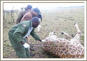 Immobilization was achieved by administration of a combination of 12mgs Etorphine hydrochloride and 50mgs Azaperone in a 3ml Dan-inject dart from a vehicle. The drugs took effect after eight minutes and the giraffe brought down with the help of ropes. He was blindfolded and made to lie on his right side for ease of examination. He was reversed immediately with 36mgs Diprenorphine hydrochloride delivered intravenously through the jugular vein.