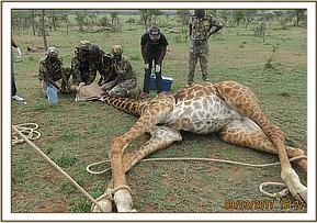 Immobilization was achieved by use of a combination of 12mgs Etorphine hydrochloride and 50mgs Azaperone delivered through a 3ml dan-inject dart from a vehicle. It took eight minutes for the drugs to take full effect whereupon he was roped down for effective restraint.