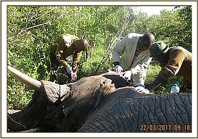He was restrained chemically by use of 16mgs Etorphine hydrochloride delivered through a 3ml dan-inject dart.Induction time was ten minutes and he assumed right lateral recumbency. Examination of the swelling revealed an old but septic wound most likely caused by an arrow.