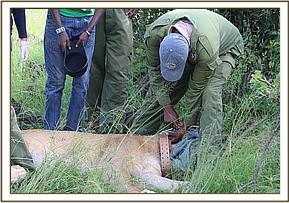 The lionesses were tracked using the old collar which still had its GPS component working. The collars were fitted with enough space to allow the lions to feed and move with ease. The lions were revived one and half hours later using 2.5 mgs of Yohimbine Hcl and monitored until they moved away on their own. Further follow up reports indicate they are doing well with the satellite component sending signals.