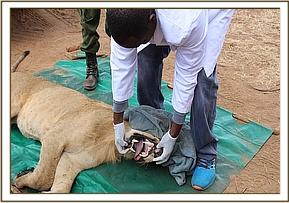 A pride of lions was reported to be terrorizing residents of Maktau area bordering Tsavo West National Park killing numerous livestock and leading to protests from the community. Several attempts were made to capture the lions, but they were all in vain. Animal call back sounds were attempted at night but no success was achieved. A trap with live goat bait was placed and a young male lion was finally captured and brought into the Voi vet clinic for examination. He was anaesthetized using 300 mgs of Etorphine and 4 mgs of Meditomidine, the canines were examined and they were ok. Anaesthesia was reversed using Yohimbine Hcl the lion was then placed in a cage and released back into the wild near the Galana River, deep inside Tsavo East National Park.