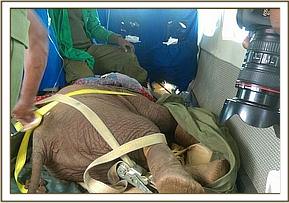 After 10 minutes, the bull went recumbent but on the left side and was thus flipped over for thorough examination and treatment. The trunk was maintained patent using a piece of stick placed across the nostril entrances. The temperature was high hence plenty of water was doused on the elephant to keep the body temperatures low. The ears were used as blindfold.