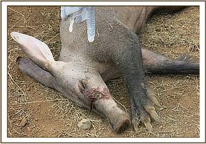 On physical examination the aardvark had suffered from compound fractures to the hind limbs and left forelimb, as well as head and spinal injury. A decision to euthanize the aardvark was made since no successful clinical intervention could be done.