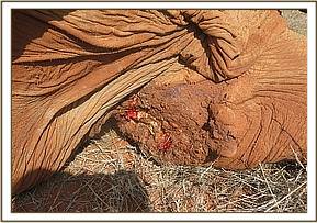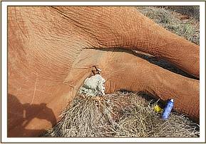 The pus was removed from the wound using swabs. The wound was then cleaned with Hydrogen Peroxide and Iodine, followed by infiltration of two tubes of Cloxacillin antibiotic cream into the subcutaneous pus drained pocket. Topically the wound was covered with wetted green clay. Another little wound with creamy pus was discovered near the spine. This was also cleaned and covered with clay. Systemically, the elephant was covered with 6000mgs Amoxicillin intramuscularly and 30mgs Dexamethasone into ear vein.