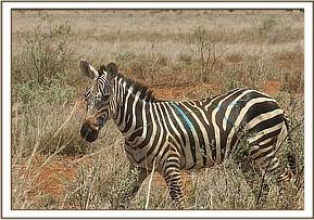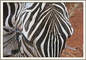 The zebra was lying on left lateral recumbence. The carcass was barely over 48 hours old. There was no discharge from the orifices and several cows were grazing within the locality. It was about ten meters from the edge of tarmac road. The carcass had good muscle cover.