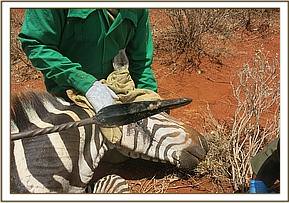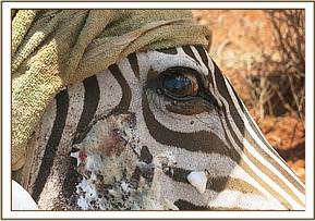 Systemically the zebra was covered with 2000mgs Tetracycline intramuscularly, 20mgs Dexamethasone into the jugular vein and 8mgs Ivermectin under the neck muscles. The dart wound was infiltrated with a tube of Cloxacillin cream to counter abscess development