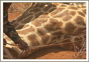 This giraffe was found alone walking slowly due to strangulation of the neck caused by a tight snare. The vet immobilized the animal using 15mgs Etorphine and 50mgs Azaperone. The snare was tight and the vet was concerned that it could compromise the anesthesia process. Once the drugs began to take effect the giraffe was roped down to right lateral recumbence and was quickly pinned down, blindfolded and the anesthetic reversed.