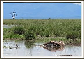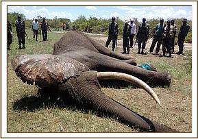 The second carcass was inside the water about a hundred meters from the first one. The head was dismembered possibly by predators who had taken it out of the water to the edge. The ivory was still lodged in the skull. The rest of the carcass was half submerged in the water and no meaningful observation was forthcoming as to tentative cause of death because of decomposition.