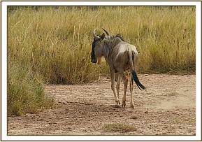 The wildebeest was darted with 4mgs Etorphine and 50mgs Azaperone. The first dart was poorly placed because of the strong wind necessitating a second dart which was perfect. Induction took ten minutes. Animal assumed right lateral recumbence and was covered with a blind fold to limit sight stimulation and corneal injury.