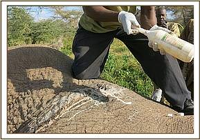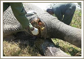 For effective examination and treatment both mother and daughter had to be darted with the daughter immobilized first followed by the dam. The calf was sedated using 5mgs Etorphine and 500 I.U Hyaluronidase in 1.5ml dart propelled by Dan –Inject darting system. Induction took five minutes and she lay on left lateral recumbence about ten meters from the mother. The Dam was darted with 13mgs Etorphine and 1000 I.U. Hyaluronidase in 1.5cc dart. She went down in a dog sitting posture in seven minutes and was pushed on to left lateral recumbence with the help of rangers. Each trunk was kept patent by use of a piece of stick across the opening distally. The top most eyes were blinded using ear flaps.