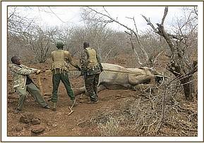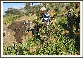 The mother tried to get up twice failed so we supported her head with the strap on the right tusk and she got up. She walked away weakly and sluggish. She then assumed sternal recumbence and we left her to get up on her own under keen watch of the rangers.