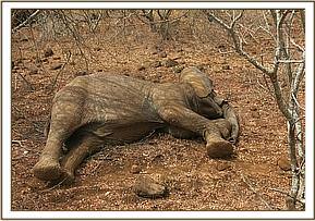 The elephant female treated the previous day in a very poor condition died later that day after the treatment. Her baby kept vigil by her side.