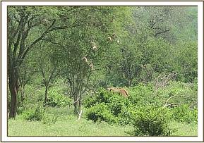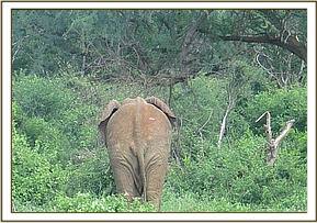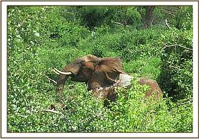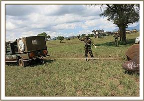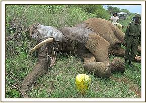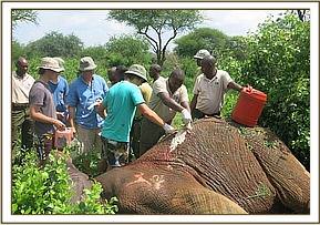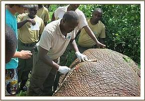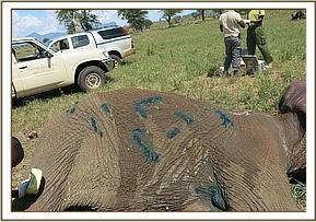 Immobilization was achieved using 18mg of Etorphine Hydrogenchloride in a 3ml Dan inject dart. Darting was carried out from a vehicle, despite the thick vegetation. The elephant was immobile after 12 minutes.Due to the high ambient temperature, the elephant was doused with plenty of water and Opticlox ointment was applied to the eyes to prevent drying. The ears were used as blind folds and a piece of stick was placed in the opening of the trunk to keep it open.