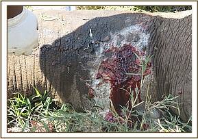 On physical examination the elephant was found to have an approximately 5 inch deep wound, which was 1-2 weeks old, on the left flank region. The wound was septic and had necrotic tissue. The wound is likely to have been caused by an arrow head which had fallen out over time. The dead tissue was debrided and removed using clean water and Hydrogen Peroxide. The wound was sterilized using tincture of Iodine. An opening on the ventral side of the wound was made for drainage to prevent further infection. Topical antibiotic cream and green clay was then applied into the wound to facilitate healing and avoid infection. The elephant was then injected with 100 ml Amoxicillin, 1200 mg Clindamycin and 100 ml Dexamethasone Sodium at different sites intramuscularly.