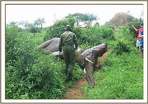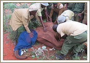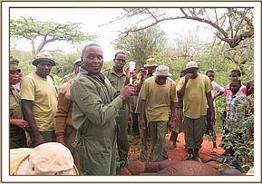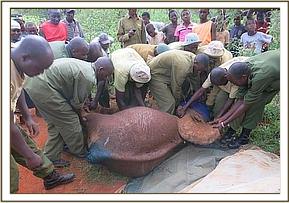 The elephant was immobilized using 6 mgs Etorphine Hydrochloride in a 1.5 cc dart using a Dan inject. Darting was done on foot due to the thick vegetation that the elephant was in. The calf was finally immobilized after 8 minutes with close monitoring of the KWS personnel and the DSWT rangers. Due to the high ambient temperature the elephant was doused with plenty of water to keep her body temperatures low. The ears were used as blindfolds. The calf was then loaded onto pickup ready for relocation.