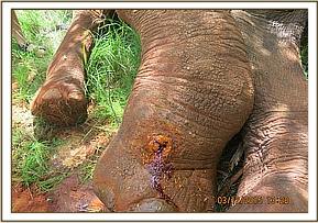 This elephant was immobilised using 18mg EtorphineHcltopped up with water for injection in a 3 ml Dan - inject dart from a helicopter. The elephant went down in a dog sitting position after 10 minutes. He was placed into lateral recumbency with the help of a landcruiser. The trunk was maintained patent using a piece of stick placed across the nostril entrances. The temperature was high hence plenty of water was doused on the elephant to keep the body temperatures low. The ears were used as blindfold. On physical examination the elephant had an approximately 5 inch deep wound (1-2 weeks old) on the right fore limb. The wound was septic and had necrotic tissue and most likelycaused by a bullet.