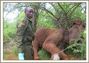 The DSWT pilot at Ithumba reported to have spotted a male elephant with a suspected arrow head injury in the right fore limb. The veterinary team had to locate and assess the elephant from the helicopter since the vegetation was thick. Plans were made on how to immobilize and treat the elephant. The elephant was in a thick bush thicket but relatively easy to dart using the helicopter. The elephant was pushed to a relatively open ground for darting.