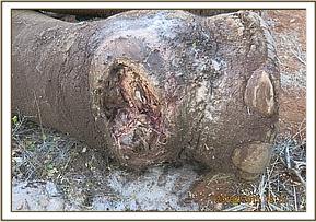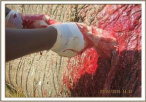 On physical examination the elephant was found to have a penetrating wound (1-2 weeks old) to his left hind limb. The wound was septic and contained necrotic tissue. The wound was likely to have been caused by a spear, which had fallen out over time. The dead tissue was debrided and removed. The wound was thoroughly cleaned using clean water and Hydrogen Peroxide and then lavaged using tincture of Iodine.