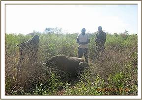 On physical examination the buffalo was found to have a swollen left forelimb, but no other physical injury could be observed, leading to a suggestion that she could have suffered from a predator attack. The buffalo was injected with 50 ml Amoxicillin and 50 ml Flunixin Meglumine at different sites intramuscularly. The entire operation lasted about 20 minutes.