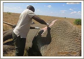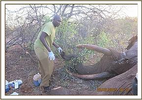 The elephant was immobilized using 18 mgs Etorphine Hydrochloride in a 3cc dart topped up using water for injection. Darting was done from a vehicle was using the Dan-inject system. Full immobilization took place after 14 minutes and he fell on his left side. However, in order to access the wound, he had to be flipped with the help of two Land Cruisers. His trunk was kept open using a piece of stick placed across the nostril entrances and his ears were used as blindfold.