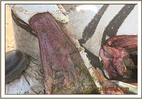 The bull was injected with 100 ml Oxytetracycline, 3 vials Clindamycin and 100 ml Dexamethasone at different sites intramuscularly. Finally, topical antibiotic ointment and grey clay was applied on the wound to facilitate healing. The operation lasted 30 minutes.