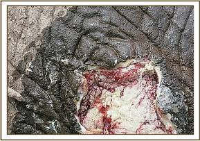 Upon examination the elephant had a penetrating wound to his left flank region. The wound was septic, contained pus and had plenty of necrotic tissue. The wound was likely to have been caused by an arrow, which had fallen out over time.