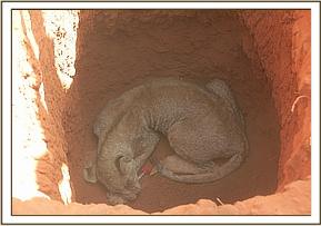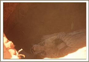 The lion was immobilized using 4mgs of Medetomidine and 296mg of Ketamine in a 3cc dart using a Dan-Inject dart gun. Full immobilization took place after 10 minutes and a blank dart was shot at him to confirm the lion was fully immobilized before entering the hole. The lion was lifted out with a sling and ropes. The lion was taken back into the bush approximately 1 km from the road and placed under a shady tree. His eyes were lubed with OptiClox but he had not sustained any injuries.