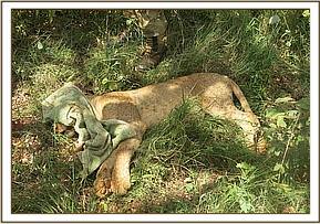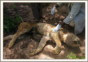 This lion was found dead next to a wildebeest carcass near Risa village. The cause of death was unknown, but a spear injury or poison was suspected. A necropsy was preformed and the following were found.