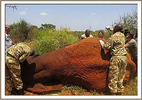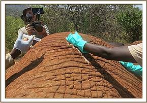 The elephant was immobilized using 19mgs Etorphine Hydrochloride in a 3cc dart using Dan-inject system from a helicopter. Full immobilization took place after 4 minutes and he fell into left lateral recumbency. The trunk was maintained patent using a piece of stick placed across the nostril entrances. The ears were used as blindfold. Plenty of water was doused on the ears (pinnae) and the entire body to help cool the elephant during the operation.