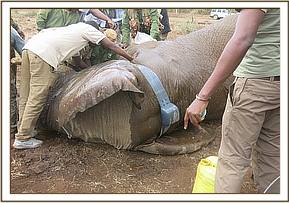 Darts were prepared using three centiliter darts in which 18mgs Etorphine were used and the rest of dart filled with water for injection. Immobilization time was ten minutes on average. On average the collaring exercise took fifteen minutes and the vet unit monitored the animal throughout. Animals were dowsed with water especially on the ears because of high ambient temperatures. Trunks were straightened and a piece of stick placed at the open end across to maintain patency.