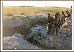 The Amboseli Park Security team while on patrol came across a baby elephant which had plunged into a water hole. The calf’s’ trumpets attracted the patrol team. They went closer and noticed the calf submerged. They tried to extract the calf manually but the aggressive mother emerged from a nearby bush and charged the team. The team took off as the mother chased them away and returned to keep watch at the water hole. It was for sure that the team could not successfully rescue the calf thus they called the vet team which was at Kuku Conservancy collaring the third elephant of the day schedule. We had just finished collaring and so quickly set out as we had a window of less than an hour and a half to travel a hundred kilometers rough road and complete the rescue before night fall.