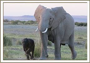 The mother heard the baby trumpet and after only covering less than a kilometer towards nearby shrubs we spotted the mothers’ trunk above the shrubs picking scent to our direction and presumed she was the one. We quickly stopped and off loaded the calf from the pick-up. By this time mother was about a hundred meters away. The calf trumpeted again and the mother charged. We quickly took off and she charged at us for about fifty meters before going back to the calf. She inspected it and recognized it. She offered it teats to suckle and it was a successful reunion.