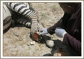 The candidate was darted from the vehicle using 4mgs Etorphine and 70mgs Azaperone topped up with water for injection. It was approached quietly and the dart propelled using Dan-Inject dart gun. The dart landed in the right thigh and zebra took off to a distance of about thirty meters and was totally immobilized in three minutes assuming left recumbence. It was recovered quickly and turned to right recumbence to facilitate observation. A blindfold was placed on the eyes to reduce visual stimuli and water poured on the body to help cool the animal from strong ambient temperatures.