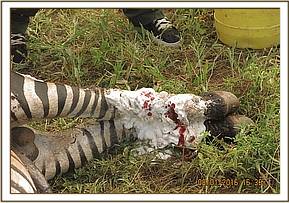 The dead tissue was debrided and removed. It was then lavaged using tincture of Iodine. Topical antibiotic cream and green clay was then applied onto the wounds to facilitate healing and avoid infection. The zebra was then injected with 30 ml Betamox L.A and 20 ml Dexamethasone at different sites intramuscularly. The entire operation lasted about 20 min.