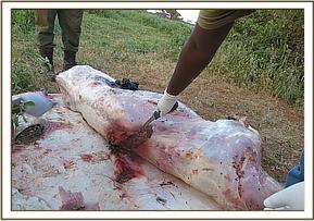 On physical examination from the land cruiser, it was clearly visible that the hippo had sustained a severe injury on the left flank region. The injury was possibly from a serious bite of another hippo possibly while fighting. The ribs were also fractured and the wound was seriously septic.