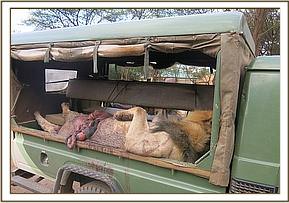 A report was made to the Amboseli National Park headquarters of a speared male lion. The lion was carried from the scene to the park HQ for post mortem.
