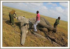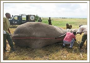 The elephant was immobilized using 17 mgs Etorphine Hydrochloride in a 3cc dart toped up using water for injection. Darting was done using Dan-inject system from the land cruiser. Full immobilization took place after 6 minutes and she fell on lateral recumbency. The trunk was maintained patent using a piece of stick placed across the nostril entrances. The ears were used as blindfold. Plenty of water was doused on the ears (pinnae) and the entire body to help cool the elephant during the operation.