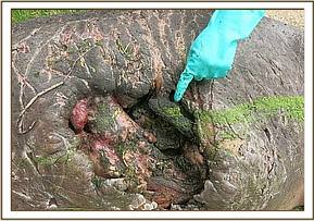 On examination, the elephant had a septic wound was on the spinal region but about 5 cm from the spine. The wound was deep (approx. 30 cm), with a clean cut. It is likely to have been caused by a spear thrown from a platform. Signs of good healing were obvious as the wound had greatly improved since the previous treatment.
