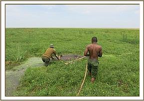 The calf had been stuck in the swamp for sometime an the mother was at a distance. The mother was kept away from the calf by use of a landcruiser as efforts were made to retrieve the baby from the swamp.
