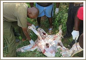 The lion had severe spear injuries to the head, abdominal and thoracic region. Several spear penetrations were clearly visible and it was evident that the lion had succumbed from the fatal spear penetrations into the vital organs of the thoracic and abdominal cavity.
